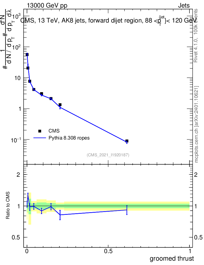 Lines: data, pythia8 8.308 ropes |