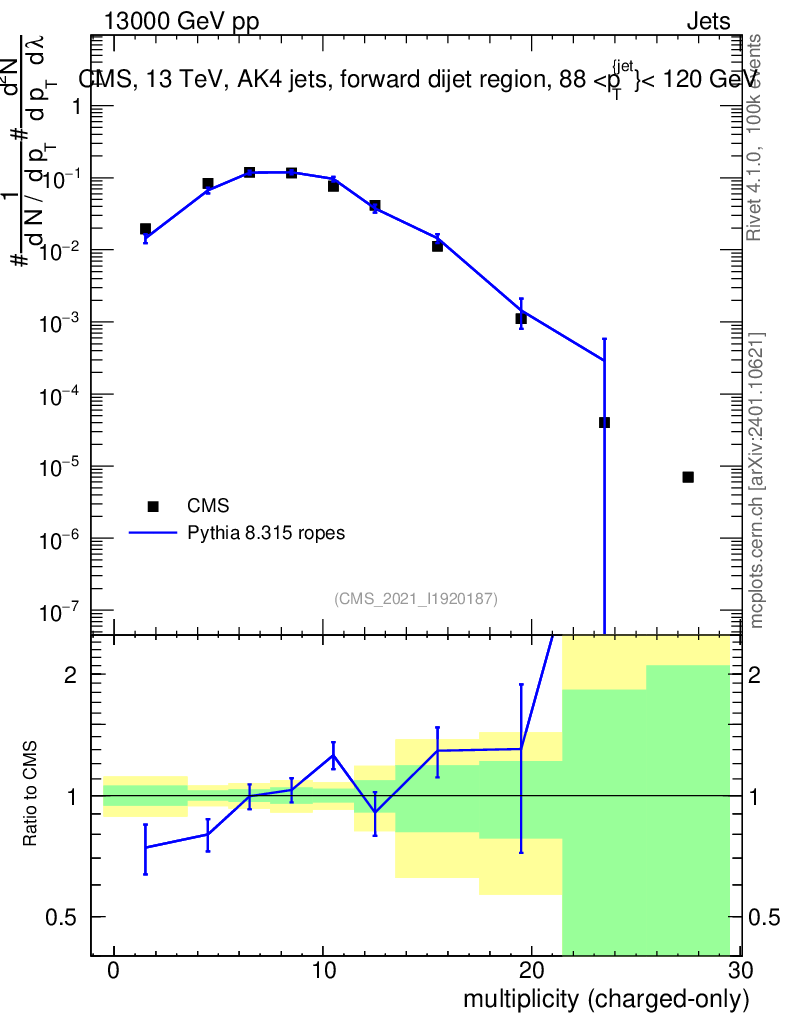 Lines: data, pythia8 8.315 ropes |