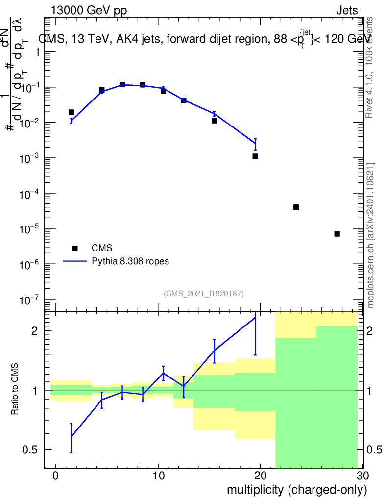 Lines: data, pythia8 8.308 ropes |