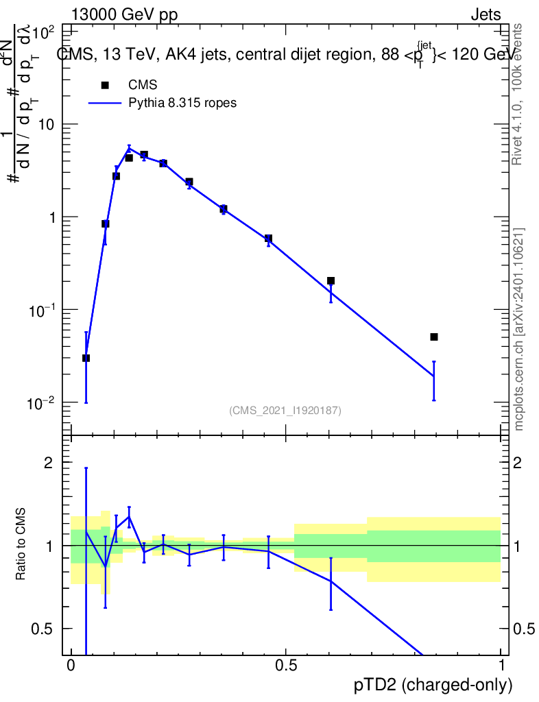 Lines: data, pythia8 8.315 ropes |