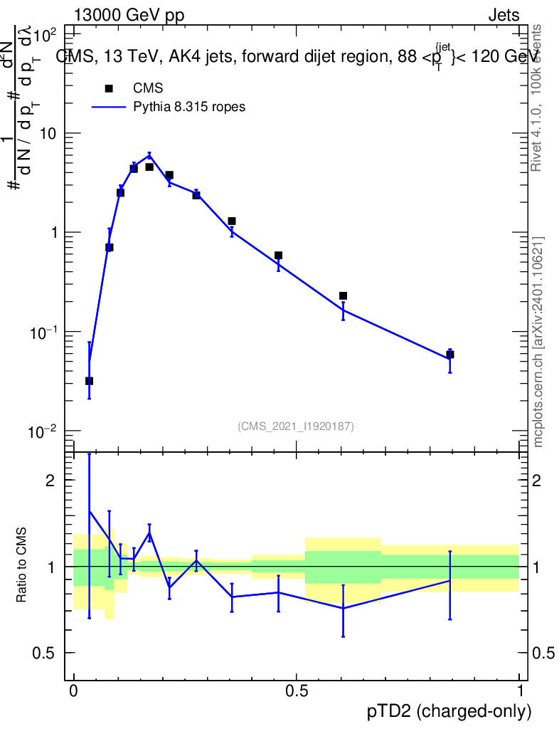 Lines: data, pythia8 8.315 ropes |