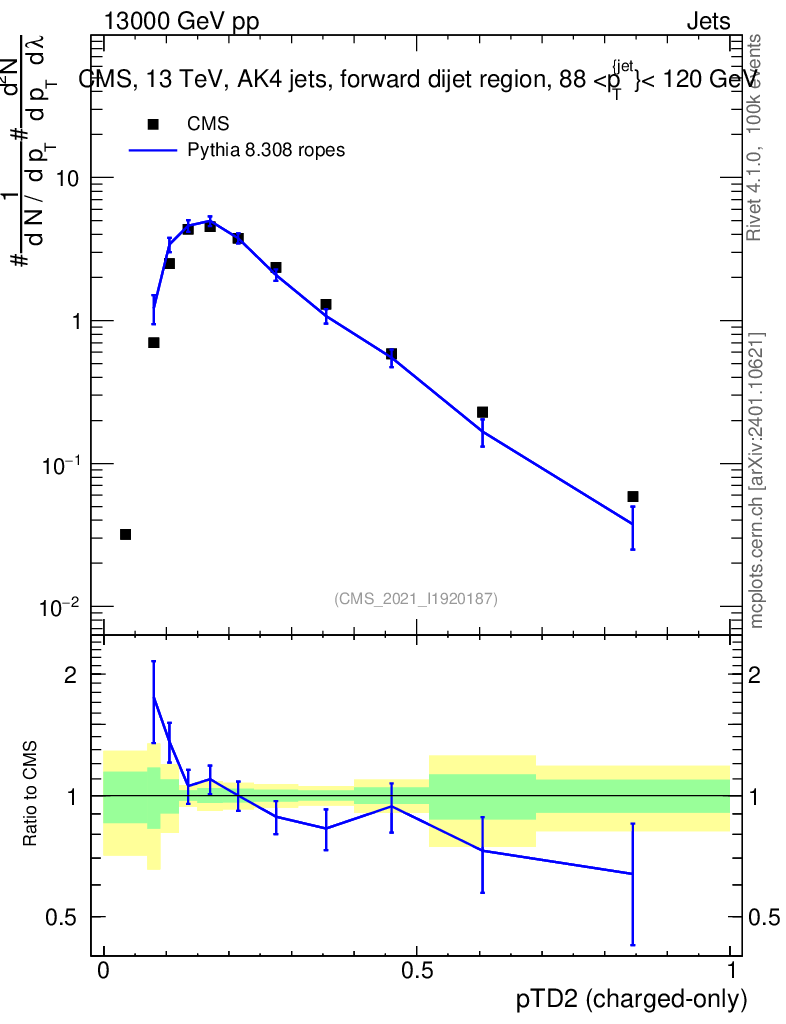 Lines: data, pythia8 8.308 ropes |