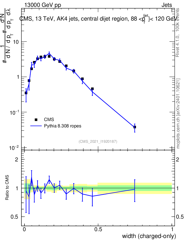 Lines: data, pythia8 8.308 ropes |