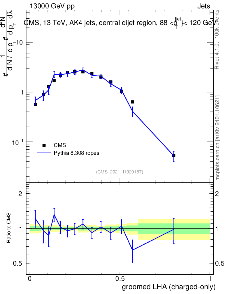 Lines: data, pythia8 8.308 ropes |