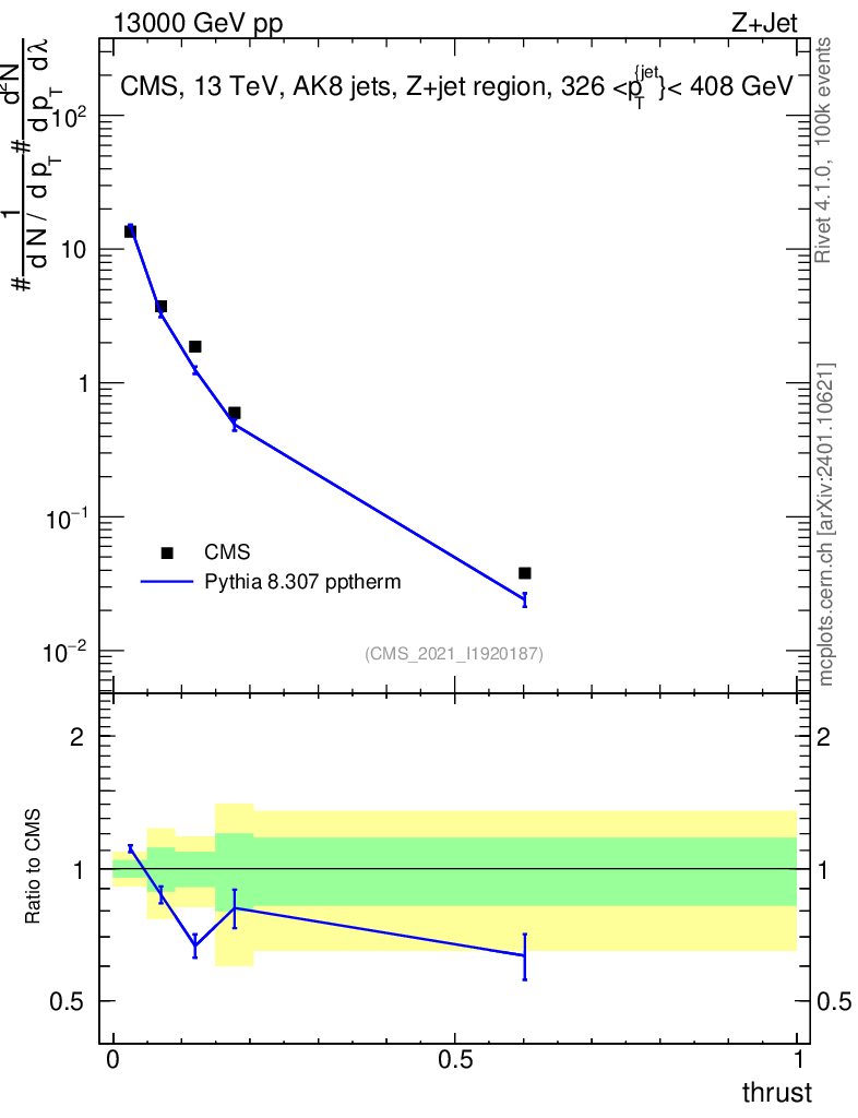 Lines: data, pythia8 8.307 pptherm |