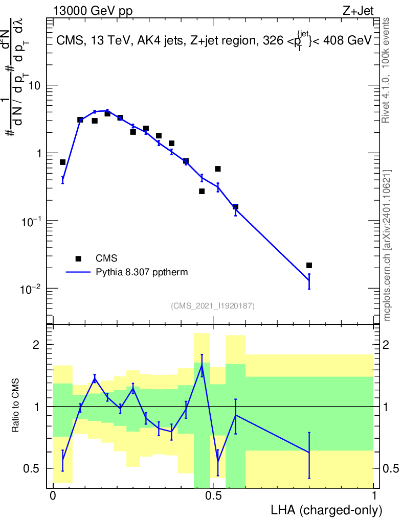 Lines: data, pythia8 8.307 pptherm |
