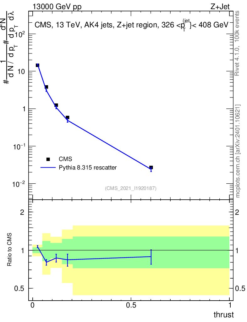 Lines: data, pythia8 8.315 rescatter |