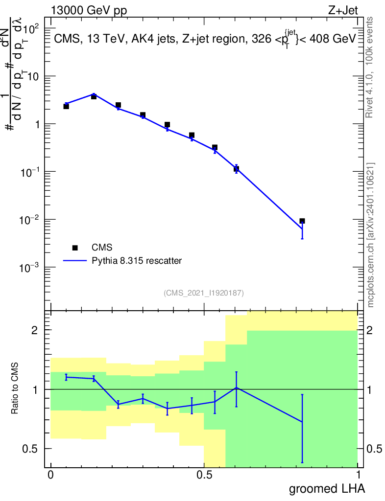 Lines: data, pythia8 8.315 rescatter |