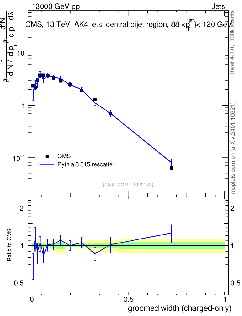 Lines: data, pythia8 8.315 rescatter |