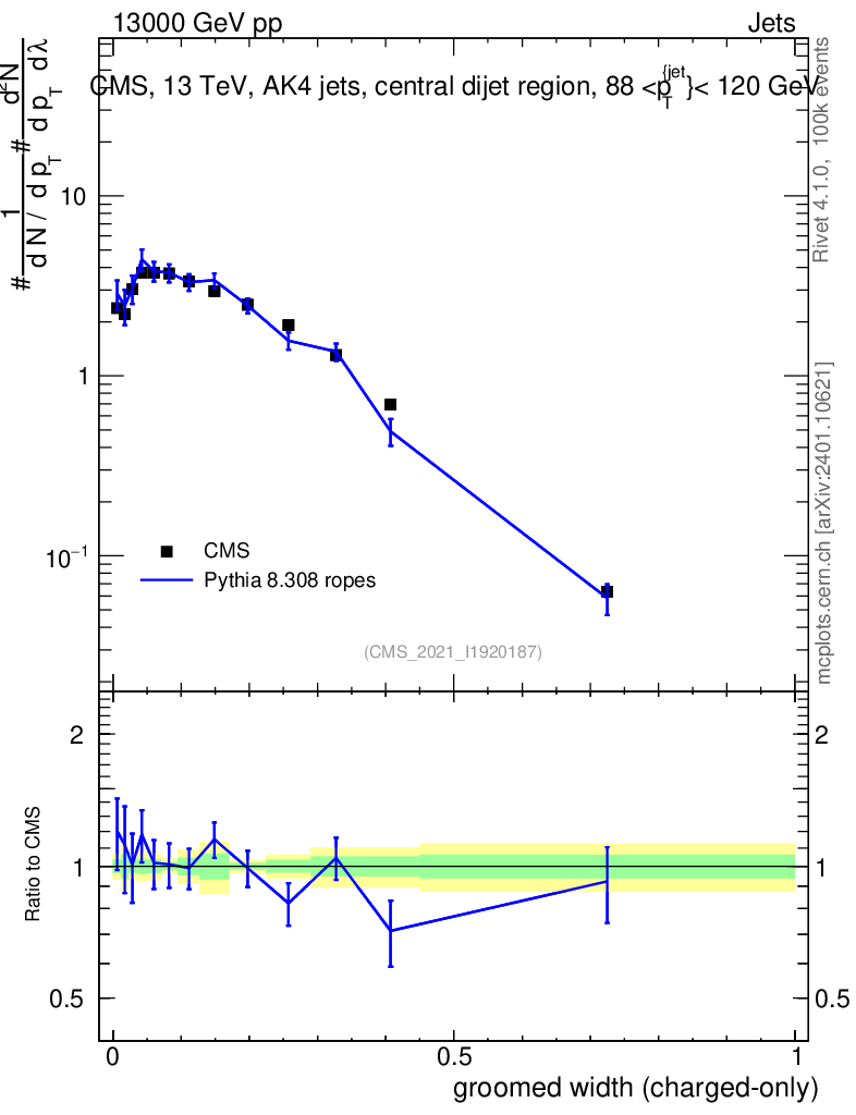 Lines: data, pythia8 8.308 ropes |