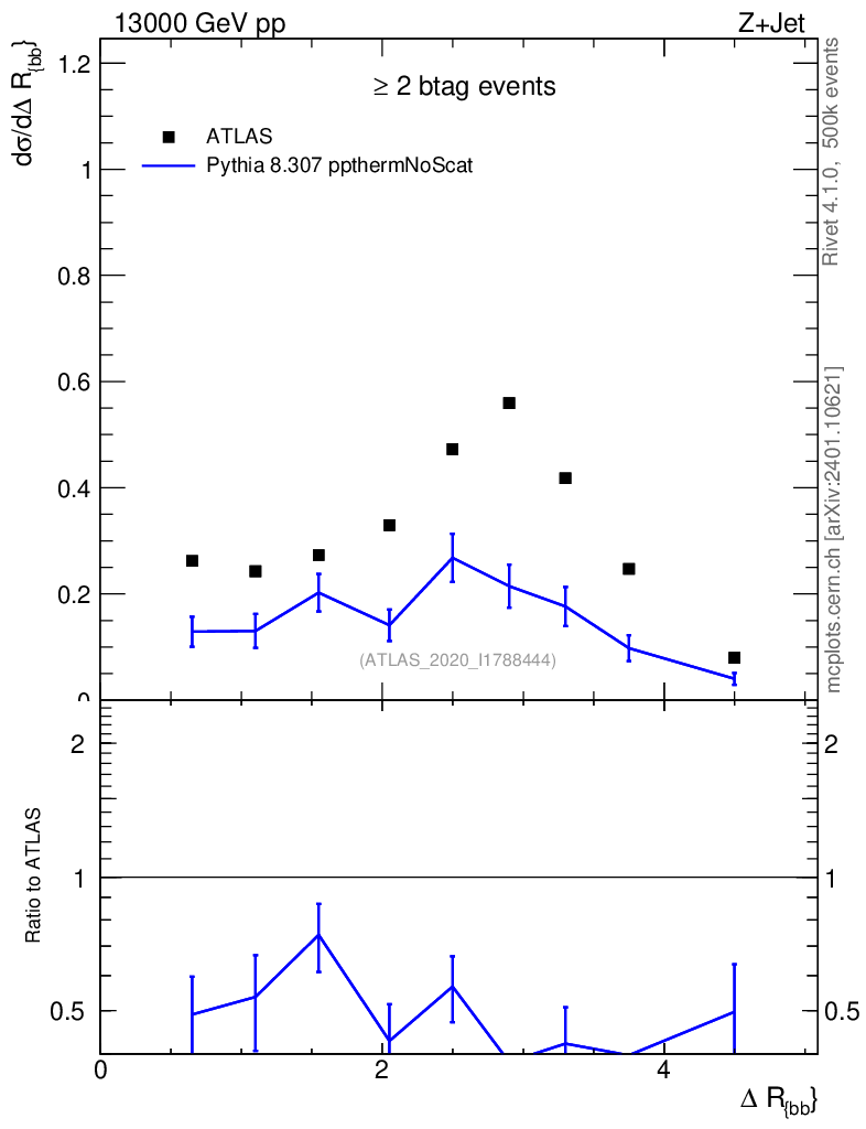 Lines: data, pythia8 8.307 ppthermNoScat |