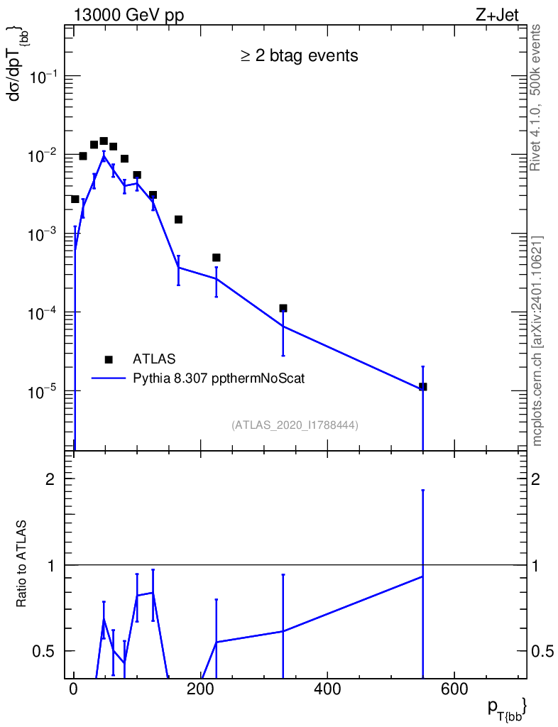 Lines: data, pythia8 8.307 ppthermNoScat |