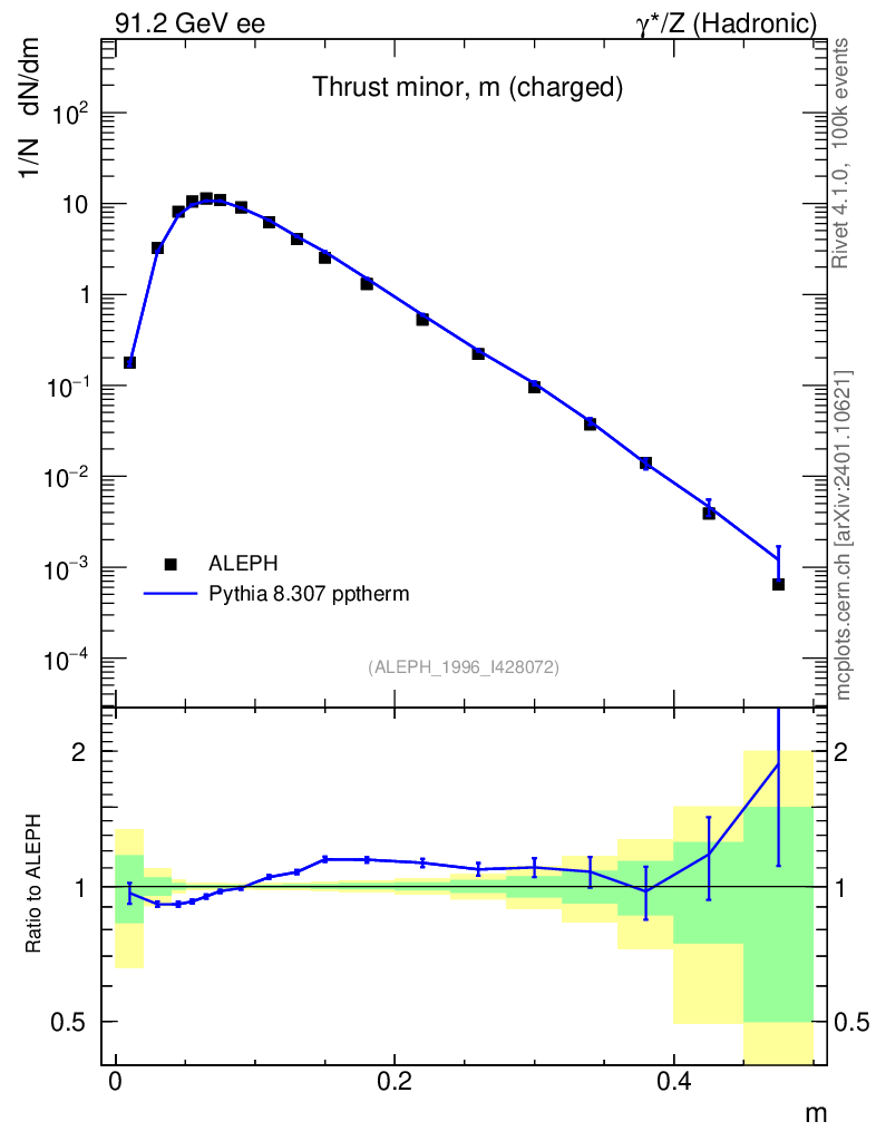 Lines: data, pythia8 8.307 pptherm |