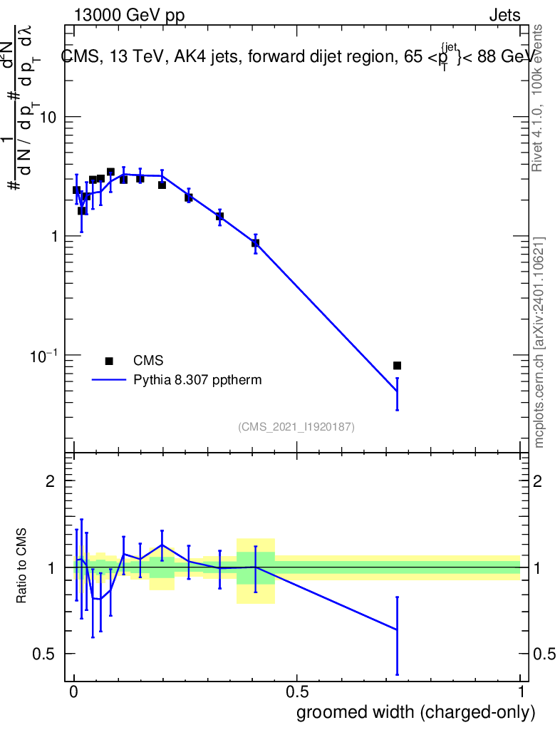 Lines: data, pythia8 8.307 pptherm |