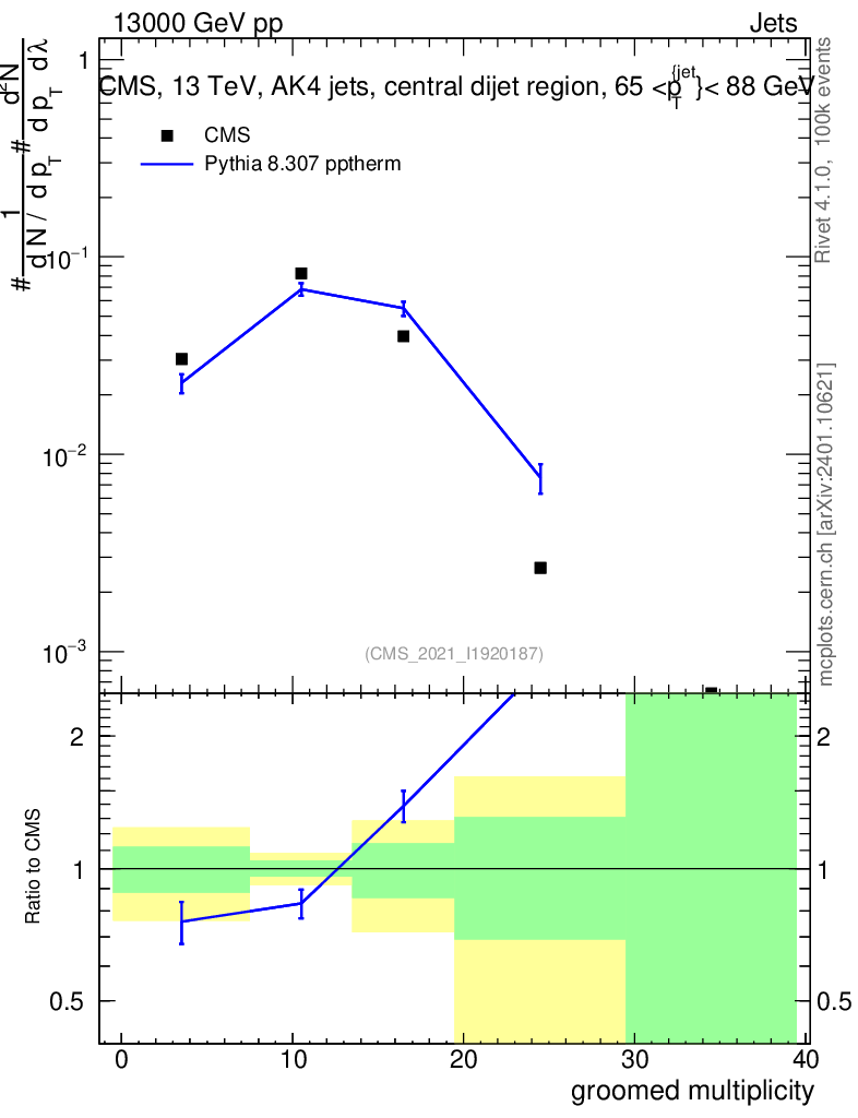 Lines: data, pythia8 8.307 pptherm |