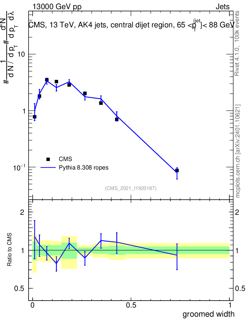Lines: data, pythia8 8.308 ropes |