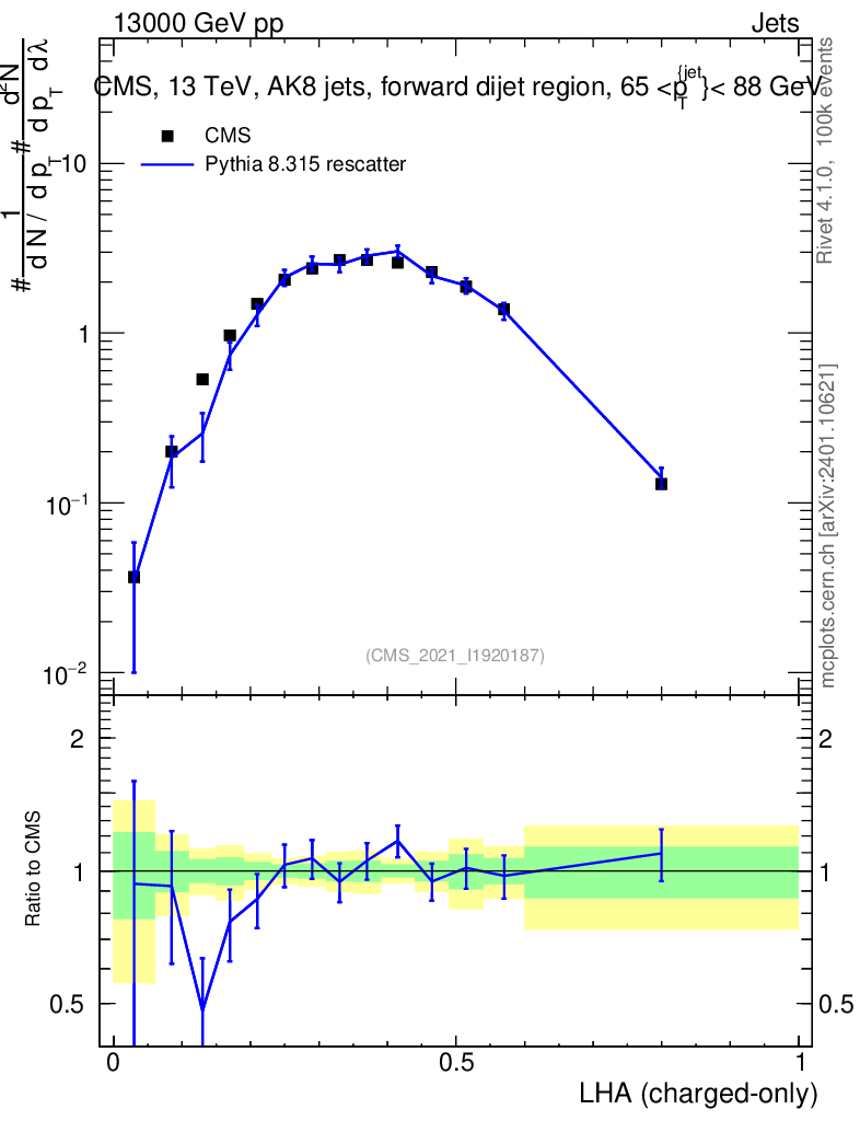 Lines: data, pythia8 8.315 rescatter |