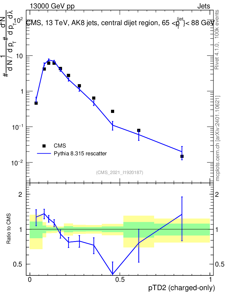 Lines: data, pythia8 8.315 rescatter |