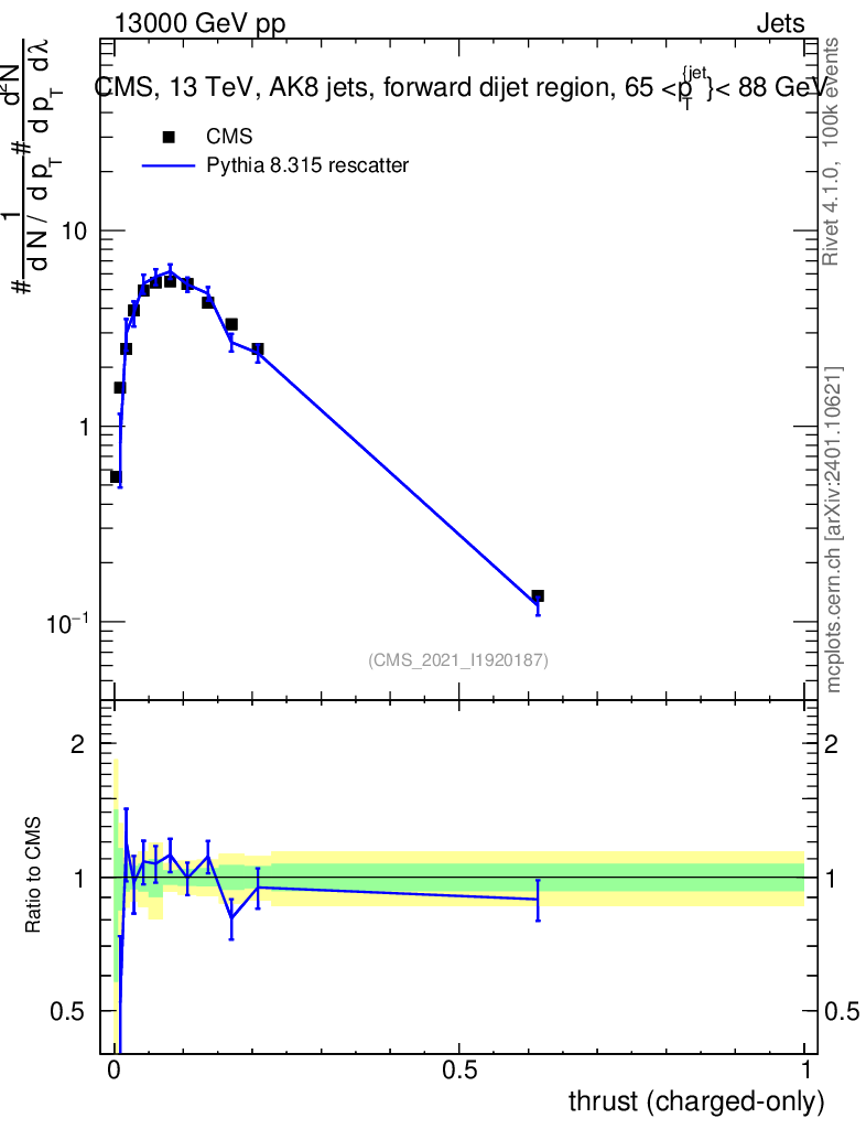 Lines: data, pythia8 8.315 rescatter |
