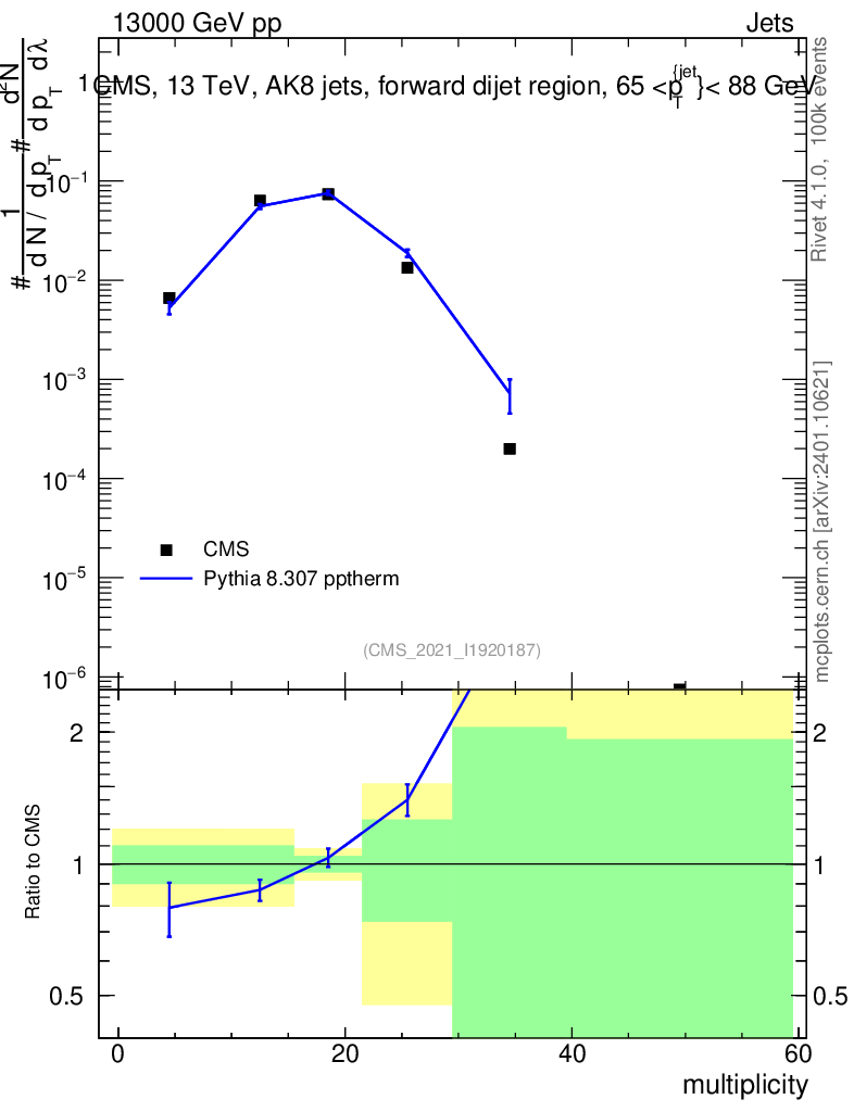 Lines: data, pythia8 8.307 pptherm |