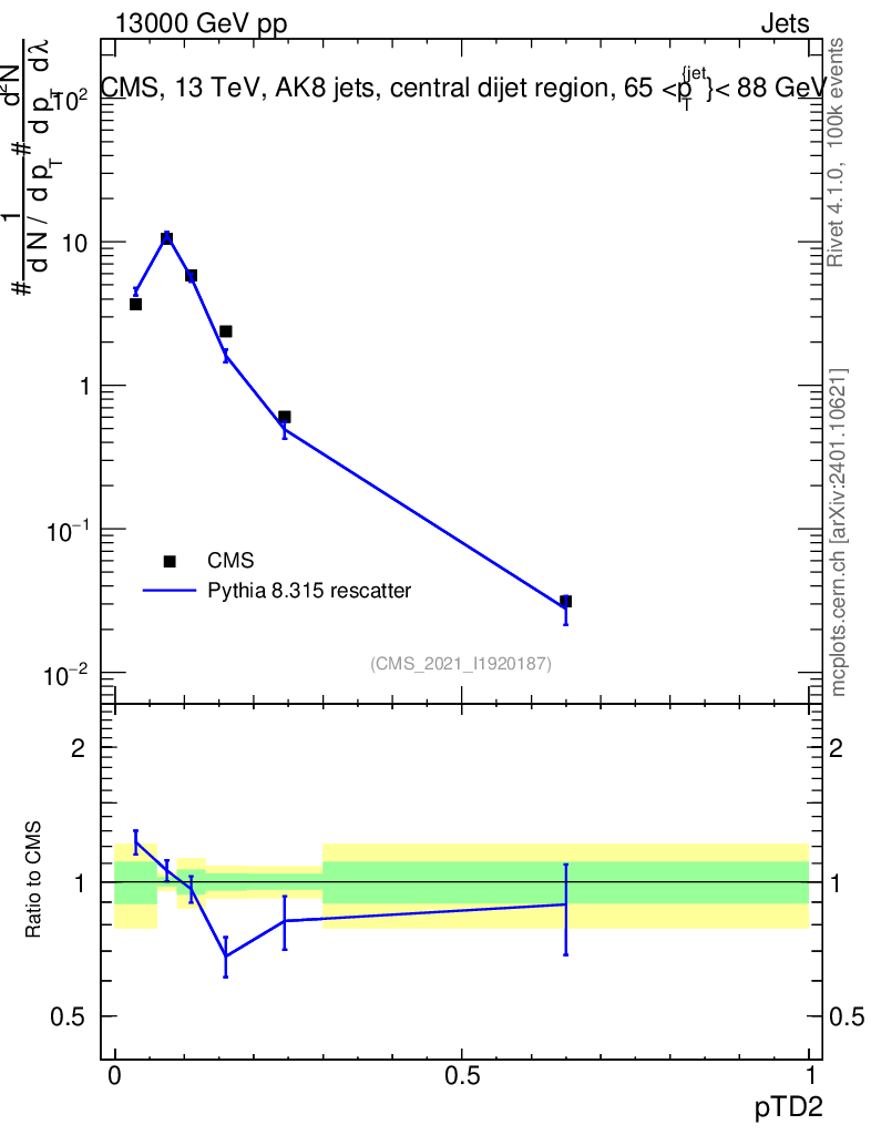 Lines: data, pythia8 8.315 rescatter |