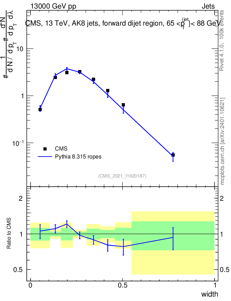 Lines: data, pythia8 8.315 ropes |