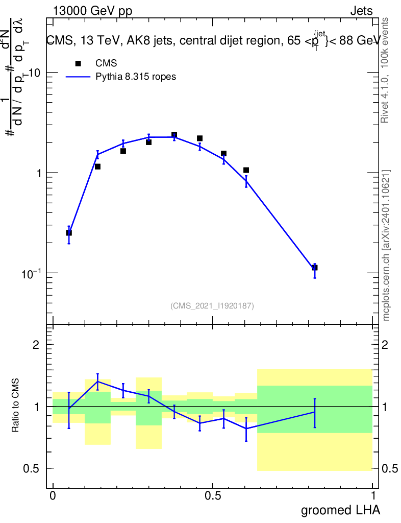 Lines: data, pythia8 8.315 ropes |