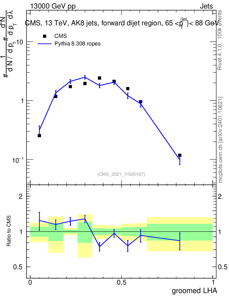 Lines: data, pythia8 8.308 ropes |