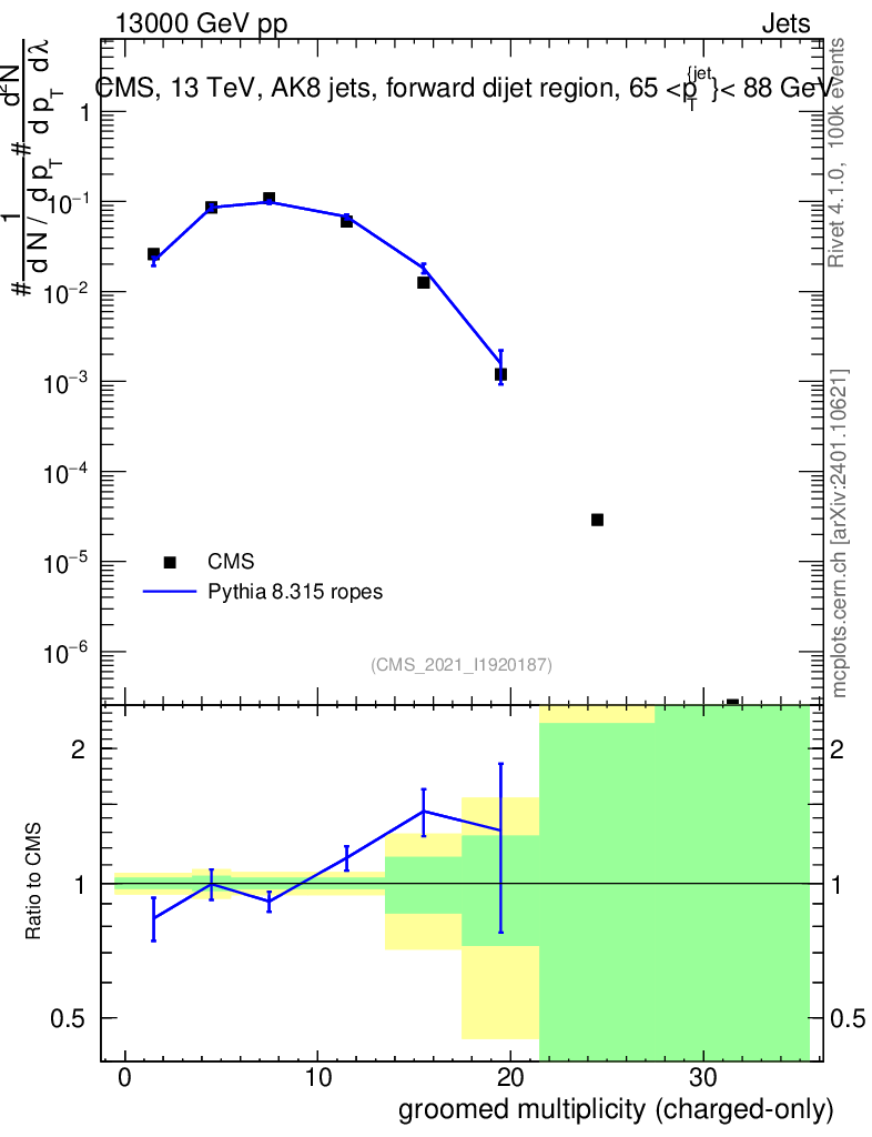 Lines: data, pythia8 8.315 ropes |