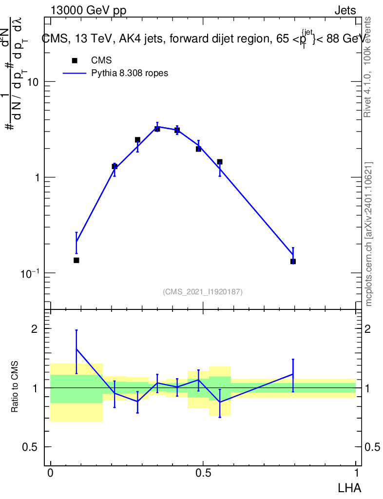 Lines: data, pythia8 8.308 ropes |