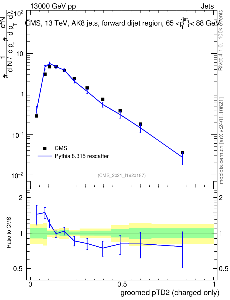 Lines: data, pythia8 8.315 rescatter |