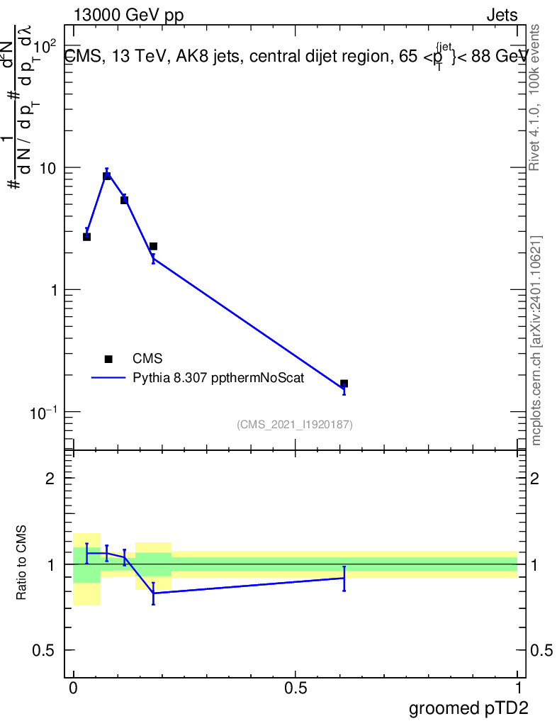 Lines: data, pythia8 8.307 ppthermNoScat |