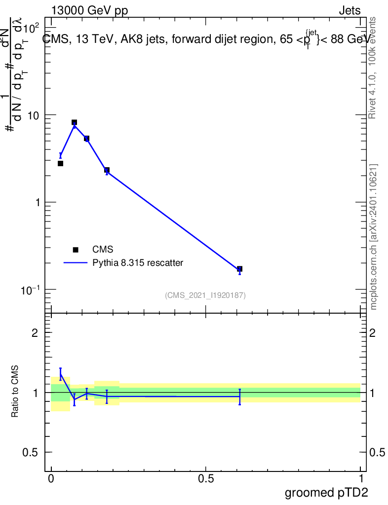 Lines: data, pythia8 8.315 rescatter |