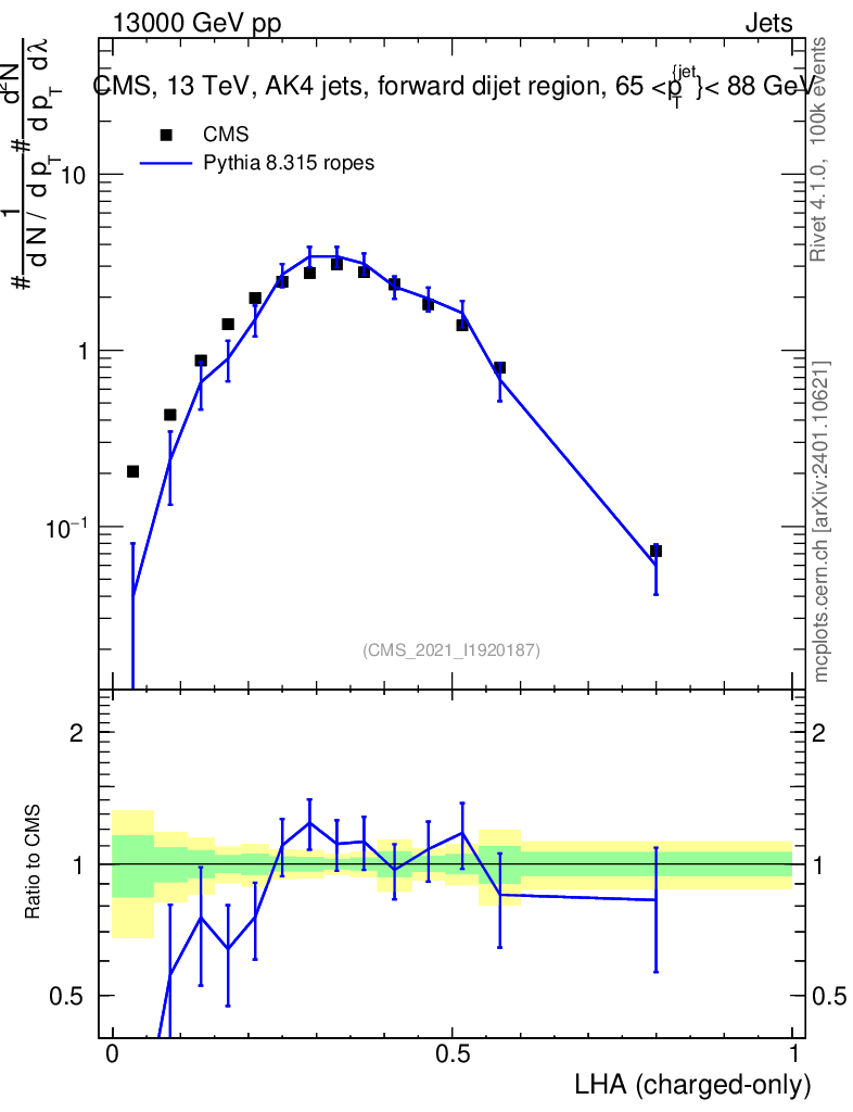 Lines: data, pythia8 8.315 ropes |
