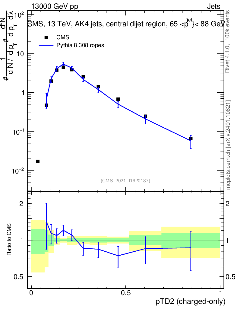 Lines: data, pythia8 8.308 ropes |