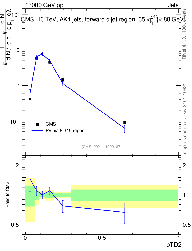 Lines: data, pythia8 8.315 ropes |