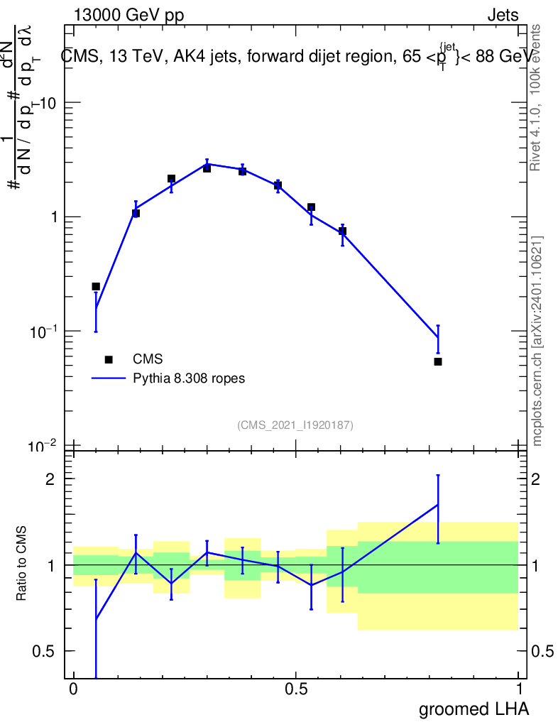 Lines: data, pythia8 8.308 ropes |