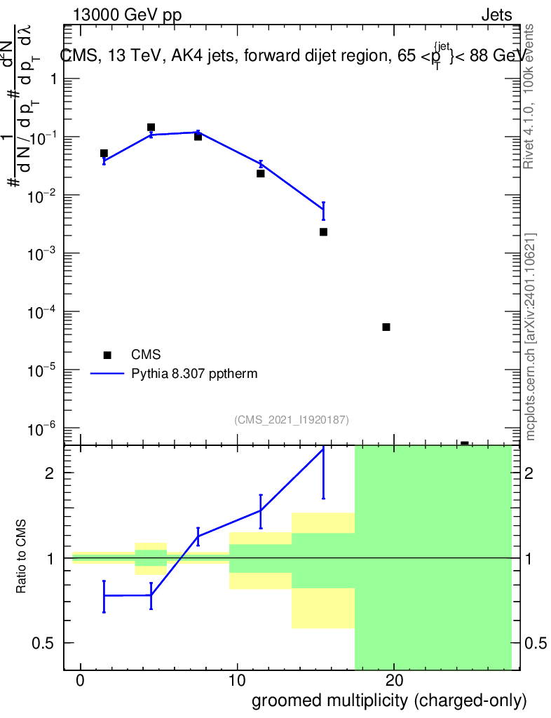 Lines: data, pythia8 8.307 pptherm |