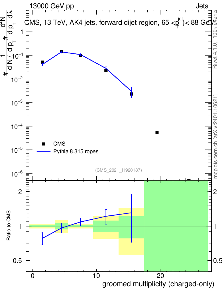 Lines: data, pythia8 8.315 ropes |