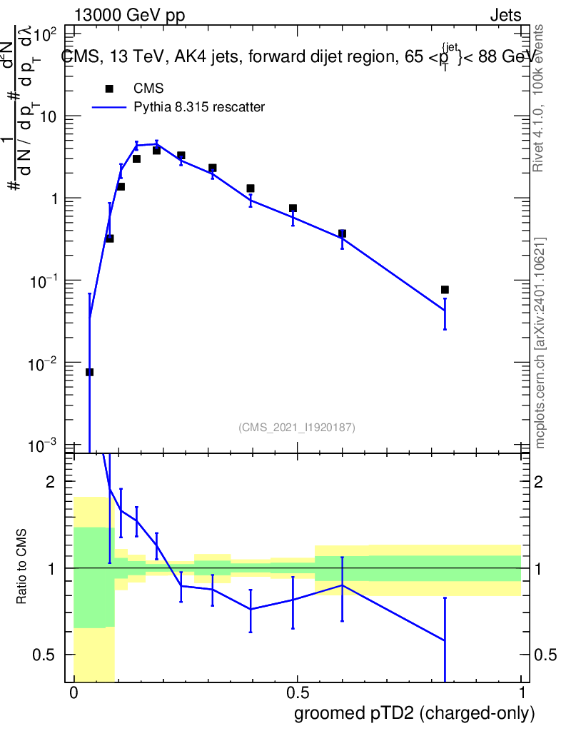 Lines: data, pythia8 8.315 rescatter |