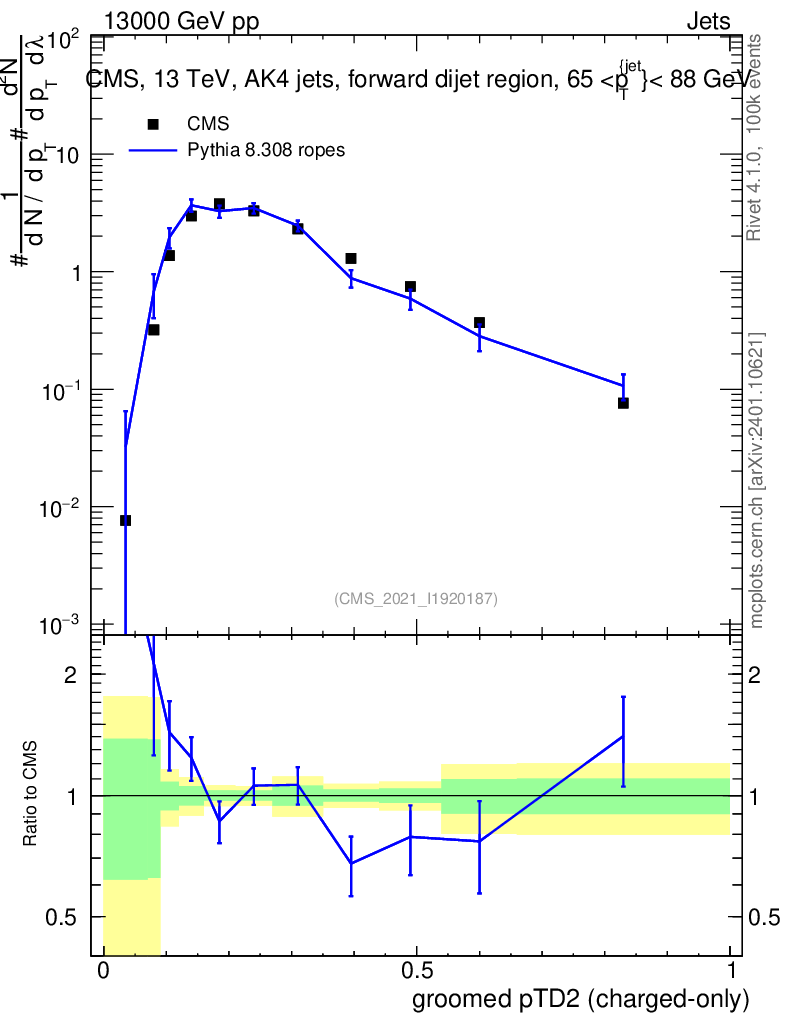 Lines: data, pythia8 8.308 ropes |