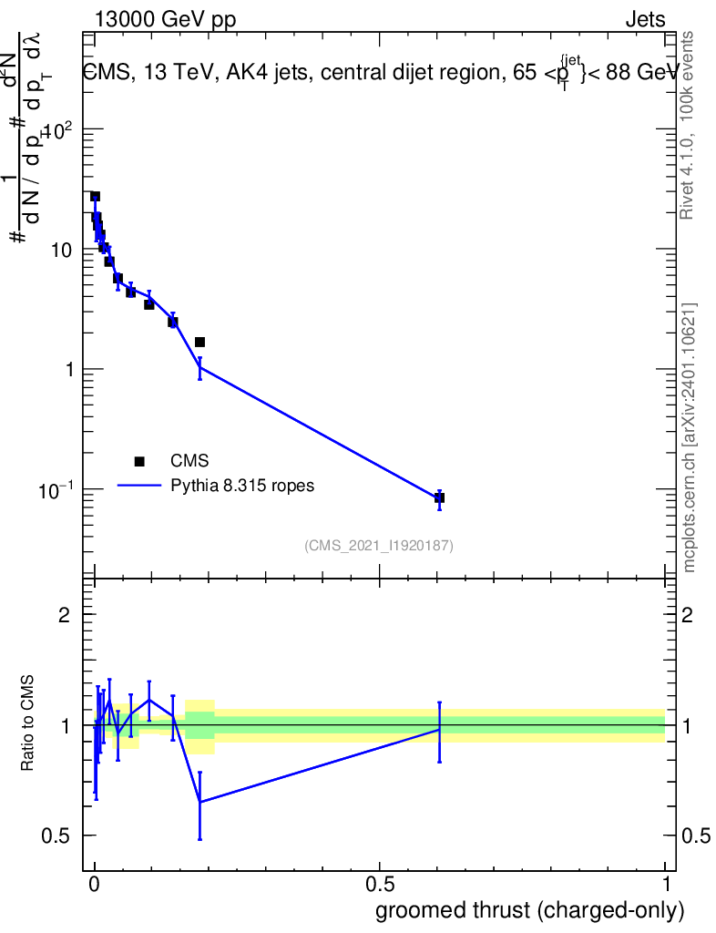 Lines: data, pythia8 8.315 ropes |