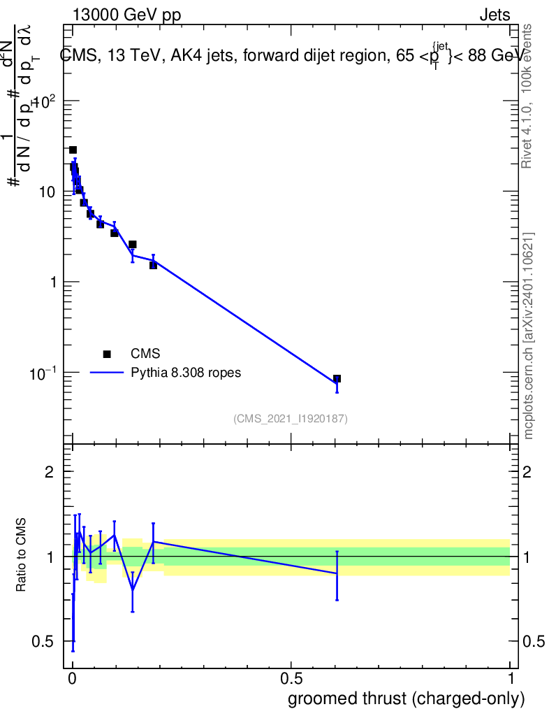 Lines: data, pythia8 8.308 ropes |