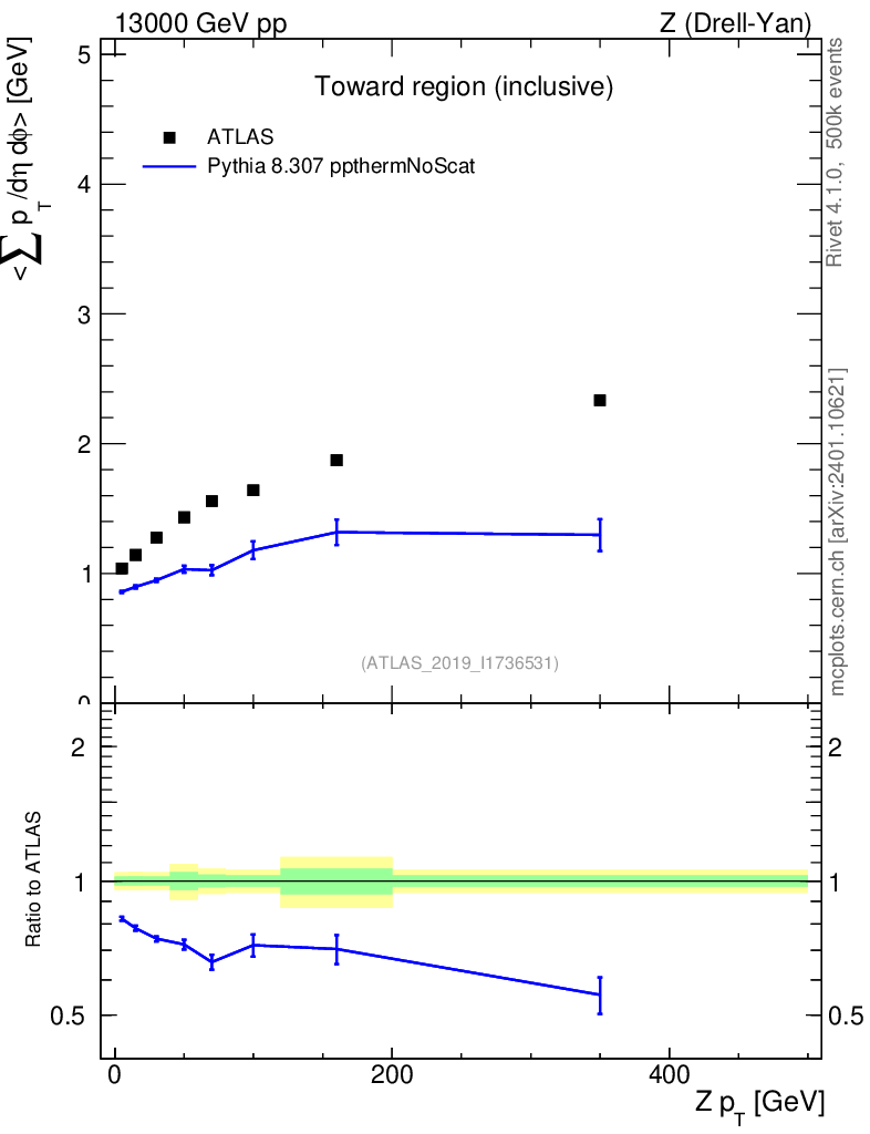 Lines: data, pythia8 8.307 ppthermNoScat |