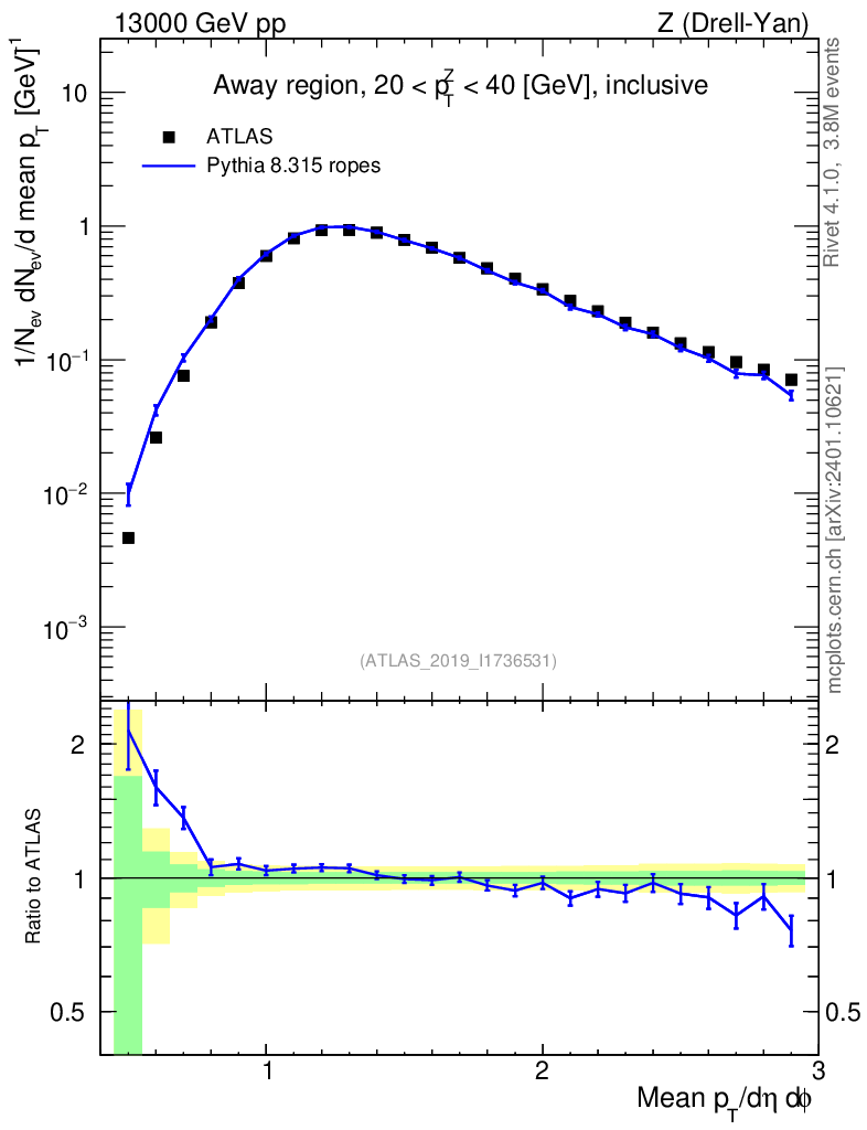 Lines: data, pythia8 8.315 ropes |