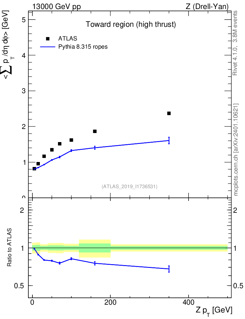 Lines: data, pythia8 8.315 ropes |