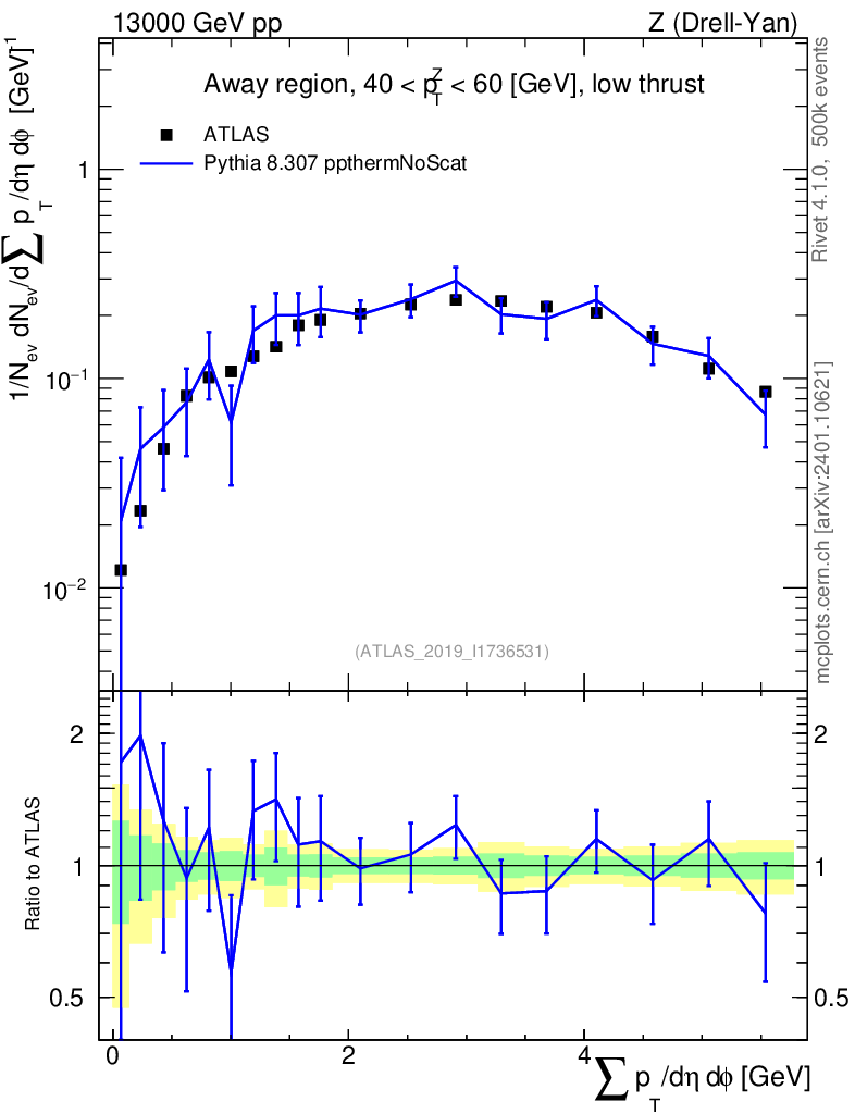 Lines: data, pythia8 8.307 ppthermNoScat |