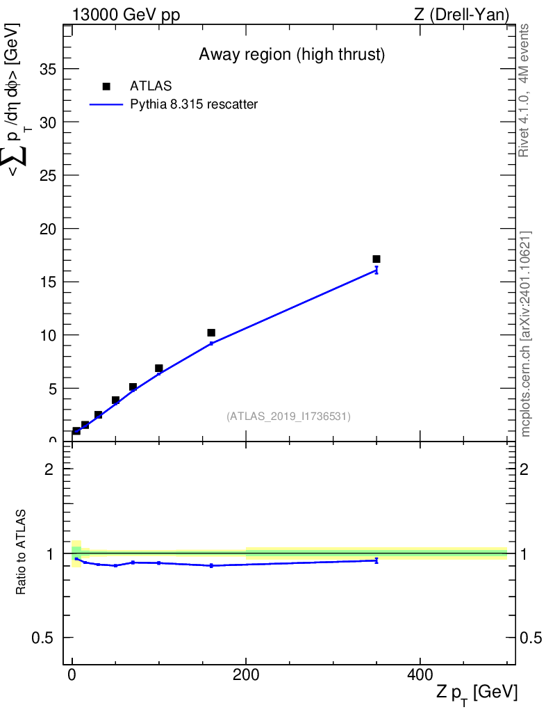 Lines: data, pythia8 8.315 rescatter |