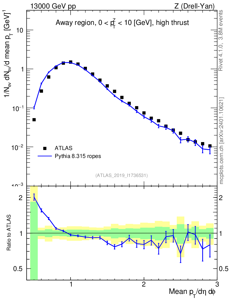 Lines: data, pythia8 8.315 ropes |