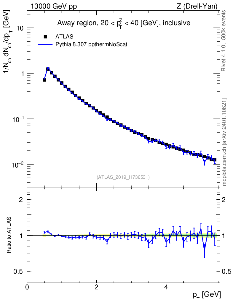 Lines: data, pythia8 8.307 ppthermNoScat |